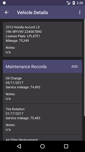 * Maintenance Record – each record has a service date, the performed maintenance task, and service mileage