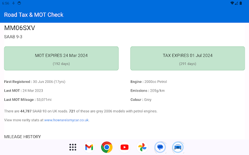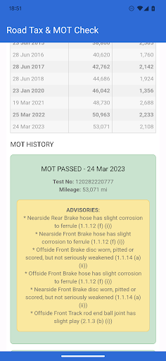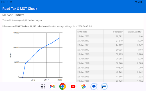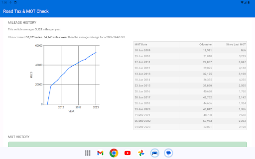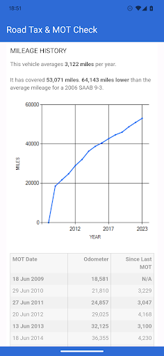 A full MOT history for the vehicle is also displayed along with a graph of the annual mileages from each MOT.