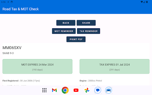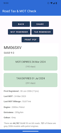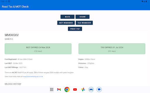 You can set road tax renewal and MOT renewal reminders from within the app as well as sharing or printing a PDF copy of the car records.