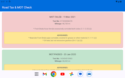 Full details are shown for each vehicle, including the road tax expiry date, MOT expiry date, vehicle information such as date of first registration, mileage, colour, engine size and emissions.