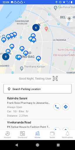 Green Markers denote Available and Red Markers denotes Full Parking. Then you tap on the marker to get the details of the Parking Area such as rates and available parking slots. You can now navigate to your desired Parking Area and park your vehicle by allowing the Agent to scan the QR generated in your smart phone against your vehicle. When you withdraw from the parking slot you will get a message on your mobile phone about parking charges to be paid to the operator.