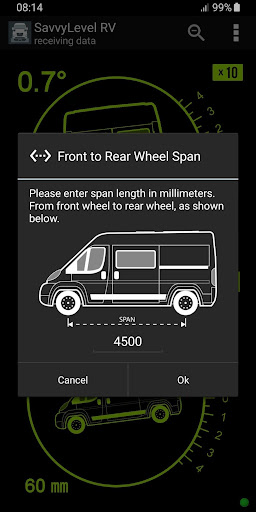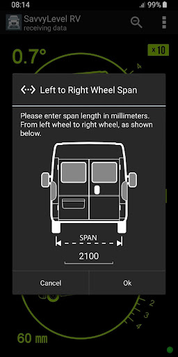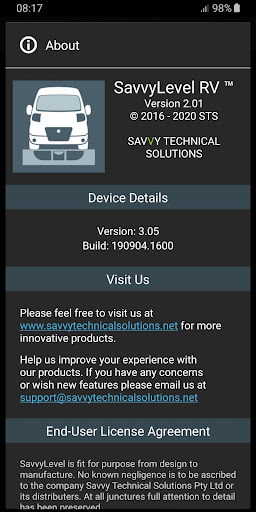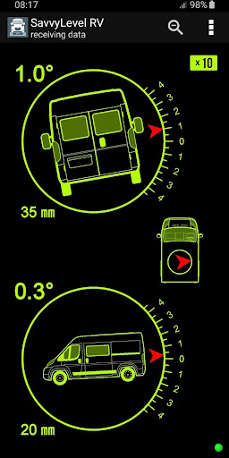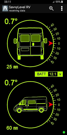 This application communicates to a small SavvyLevel device (via bluetooth) which is mounted inside your vehicle. Extremely easy to use and has an accuracy down to within 0.1 degree. Once installed it only requires a simple, one-time calibration.
