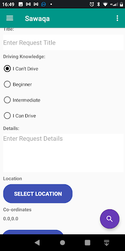 Sawaqa Driving Lessons Locator – Students App. App used by students only to post learning requests and find nearby teachers and driving instructors