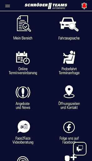 Mit der App von Schröder Teams Automobile verpassen Sie keines unserer Fahrzeug-Highlights. Die praktische Push-Funktion versorgt Sie stets mit den neuesten Angeboten und News aus unserem Haus. Informieren Sie sich detailliert über unsere Fahrzeuge, stellen Sie bei Interesse einfach eine Anfrage per App, rufen Sie uns direkt aus der App heraus an und senden Sie Terminanfragen für Probefahrten oder eine persönliche Beratung direkt über den appinternen Chat an unser Team.