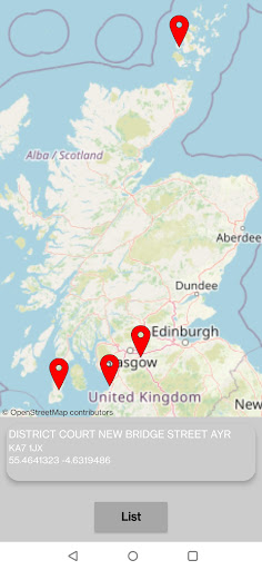 * Map screen with location pins.