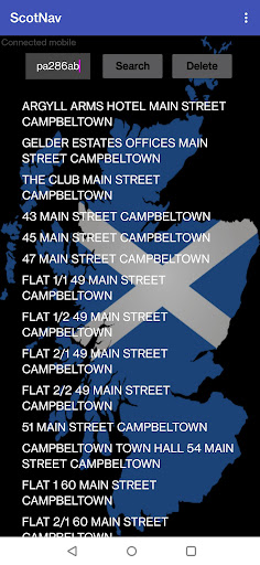 ScotNav displays all addresses, house names and numbers, for the chosen postcode, just select your choice from the list of addresses and navigate straight to the door first time.