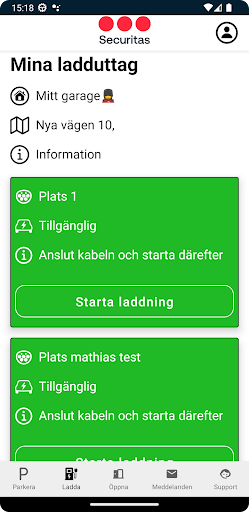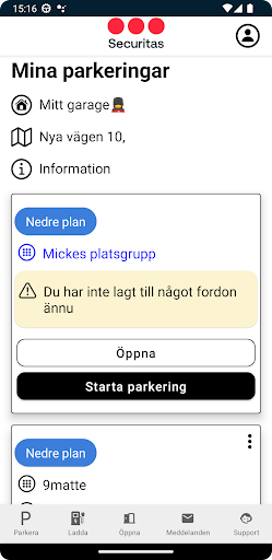 I Securitas Parkering kan du administrera dina avtal, ändra betalmetod samt givetvis öppna porten till ditt garage och din plats. Om du har avtal för elbilsladdning kan du även starta laddaren via appen.