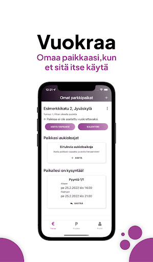 Parkkipaikan omistajana voit asettaa parkkipaikkasi sovellukseen vuokrattavaksi, ja vapauttaa sen silloin, kun et sitä itse käytä. Voit asettaa vapaana olevia aikoja myös tulevaisuuteen – jos tiedossasi on siis vaikkapa mökkiviikonloppu, miksi et tienaisi käyttämättömällä parkkipaikallasi? Voit myös itse vaikuttaa paikkasi hinnoitteluun, niin tunti- päivä- tai viikkokohtaisestikin.