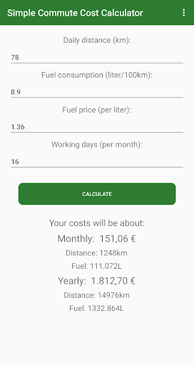 Simple useful calculator for calculate the commuting costs / travelling costs. You can calculate the monthly and the yearly costs with fuel usages. The region can be changed to use the correct currency.
