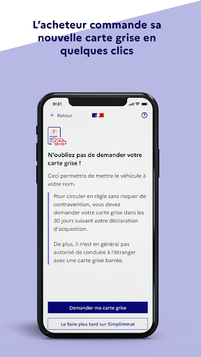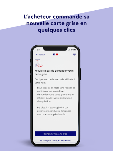Simplimmat est l’application officielle de l’Etat pour simplifier les démarches administratives des particuliers qui revendent ou rachètent un véhicule d’occasion. Le vendeur et l’acheteur réalisent ensemble la déclaration de cession, la procédure est totalement sécurisée et dématérialisée (il n’est pas nécessaire de remplir un CERFA papier). L’acheteur peut commander sa nouvelle carte grise dans la foulée et obtenir immédiatement son certificat provisoire d’immatriculation