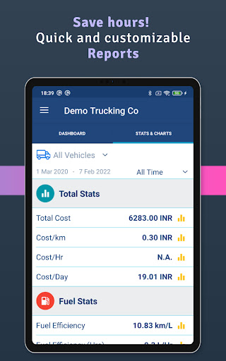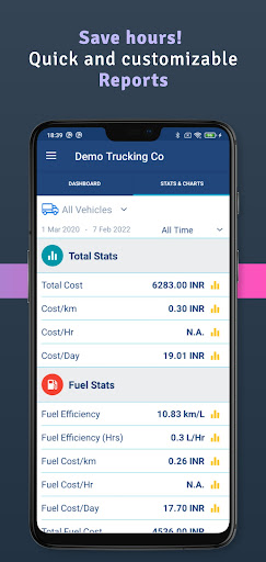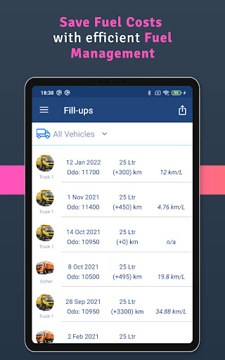 Fuel management: Scan receipts to add fill-ups. Drivers can upload receipts and other information for every fill-up. You can also measure fuel consumption for machines and equipment with Hour Meters. Get in-depth reports and analysis of the vehicle’s fuel-related costs, fuel usage and efficiency.