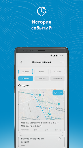 – просматривать историю поездок и всех событий на маршрутах автомобиля
