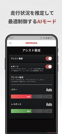 パワー/レスポンスをお好みに設定。全自動で快適なアシストが得られるAIモードも利用可能です。