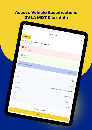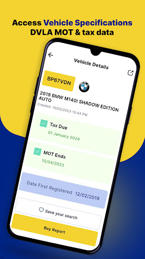 – Access the MOT and tax due date, vehicle specifications, registration data, and year for free.