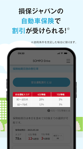ご契約の自動車が自家用8車種であり、かつご契約の等級が6(S)等級または7(S)等級となる場合で、記名被保険者がスマートフォンアプリ『SOMPO Drive』の運転診断を実施したときは、その運転履歴に基づき算出された安全運転スコア※に応じて、「安全運転割引」として保険料を割り引きます。
