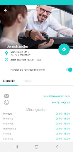 Außerdem erinnert Sie die App an wichtige Termine rund um Ihr Fahrzeug (Garantieende, technische Überprüfungen, usw.) und Sie haben in Notfällen alle wichtigen Kontaktdaten zur Hand. Per „Klick“ rufen Sie Ihr Autohaus an oder schreiben eine E-Mail an Ihren Händler.