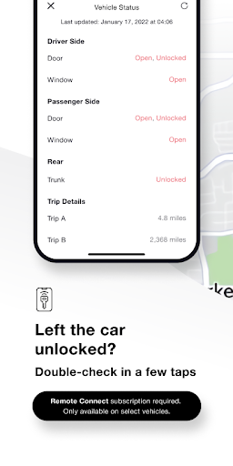 Lock/Unlock your doors – Not sure if you remembered to lock your vehicle? Not anymore. Remotely lock and unlock your doors and receive confirmation once the action is complete (WearOS supported).