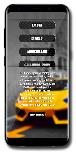 The app contains a collection of 20 supercar brands and a total of 97 supercar sounds showcasing both the start-up and engine revs. Upon choosing the engine sound you wish to play you will also get a brief text displaying interesting information about the selected car model.