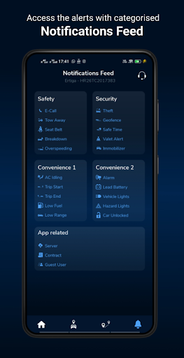 to the safety and security of your loved ones. These alerts include Emergency Alert, Breakdown Alert, Tow Away, AC idling, Intrusion Alert, Geofence, Valet Monitoring, Forgot to operate- Door Lock, Headlight, Seatbelt Alerts. Customizable Alerts like Low Range, Low Fuel, Overspeeding and Safe Time ensure to keep an eye on your car for your safety and convenience.