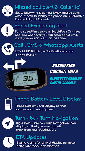 Suzuki Ride Connect allows you to connect your smartphone with Suzuki 2-Wheeler’s Connected Digital Console using Bluetooth® Wireless Technology.