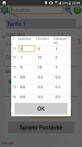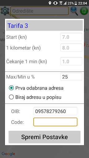 U postavkama definirate cijene starta, 1 km i čekanja te odabirete jedan od dva načina traženja adrese odredišta.
