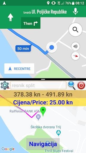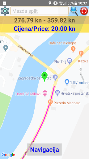 Vožnja se starta klikom na zelenu tipku gore desno i program prikaže min i max cijenu, nacrta rutu, počne brojiti kune te aktivira navigaciju.