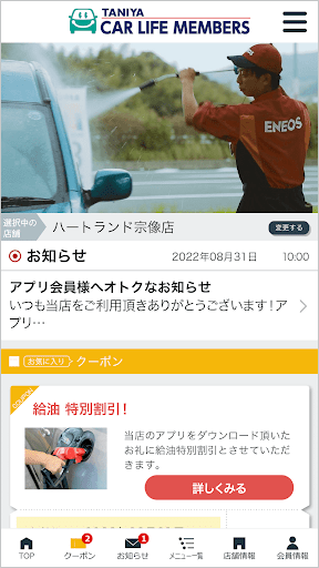 また谷弥石油株式会社が展開するサービスステーションでご利用いただけるお得なクーポンや各種メニューの割引情報も配信しております。