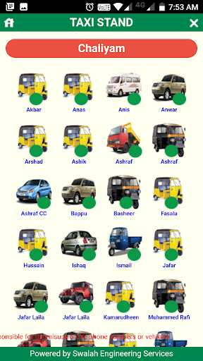 It shows the list of Taxi vehicles in an area (stand) with their status. People can view the vehicles in a selected stand and call the free vehicles for their trip. Drivers can change their status to free (green) or busy (red). Busy vehicles are not allowed for calling.