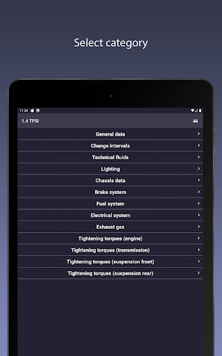 Data is divided into categories: general information (car engines, etc), chassis, tightening torques of bolts and nuts, fuel system, brake system, lighting lamps, replacement intervals and volumes of technical fluids.