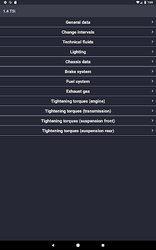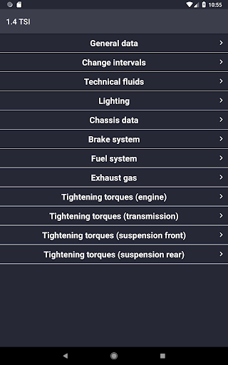 Data is divided into categories: general information, chassis, tightening torques of bolts and nuts, fuel system, brake system, lighting lamps, a replacement intervals and volumes of technical fluids.