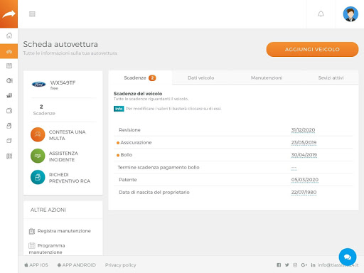 Associando il proprio veicolo tramite la TARGA il sistema rileva la maggior parte delle informazioni di pubblico dominio. (marca, modello, data di immatricolazione, classe di inquinamento, scadenza patente, scadenza bollo, etc.)