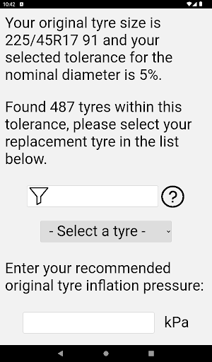 – Find suitable tyres based on your original tyre diameter and calculate new inflation pressure.