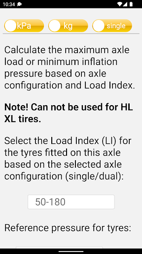 – Optimize your inflation pressure (minimum inflation pressure to be used) based on axle configuration, axle load and Load Index or calculate the maximum allowed axle load based on axle configuration, inflation pressure and Load Index.