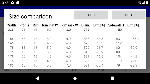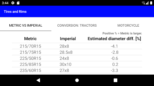 – Comparisons of metric and imperial tire sizes now also for motorcycles and tractors