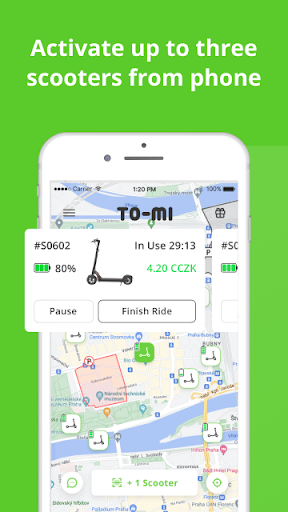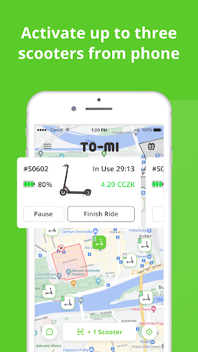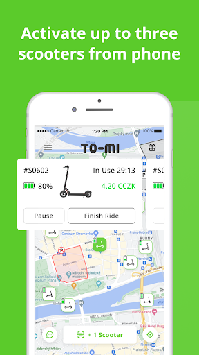 – Otevřete aplikaci a najděte na mapě nejbližší elektrokolobežku TO-MI electro – Odemkněte ji zadáním kódu zobrazeného na elektrokolobežce v aplikaci