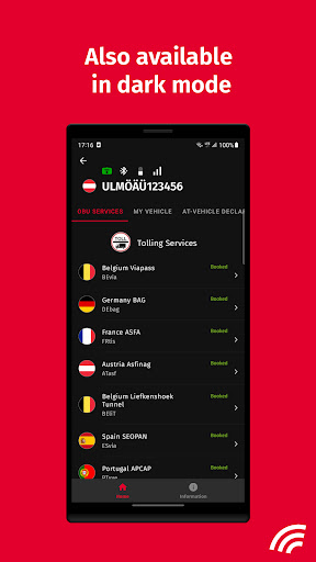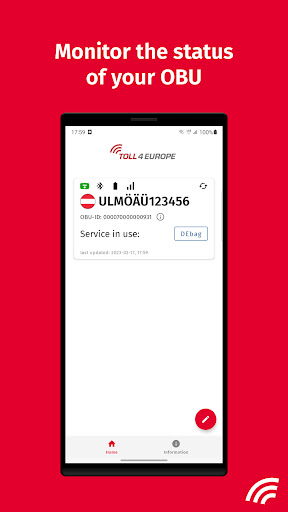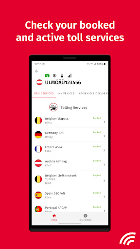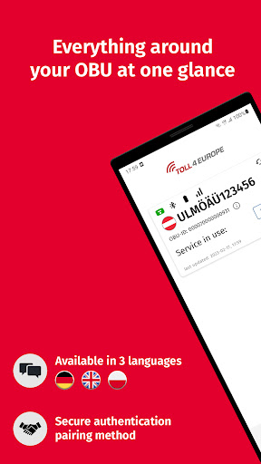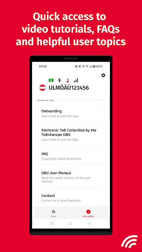 Toll4Europe customers are provided more features by connecting their smartphone or tablet with their Toll4Europe OBU. The app will display current information on booked services, OBU settings, configured vehicle data and documents like the vehicle declaration.