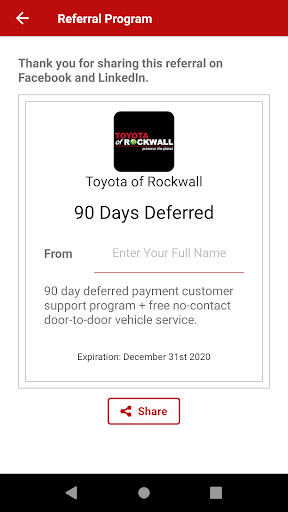 Toyota of Rockwall dealership loyalty app provides customers with an enhanced user experience. The mobile dealership app provide customers with relevant specials and loyalty offers. Key features include: