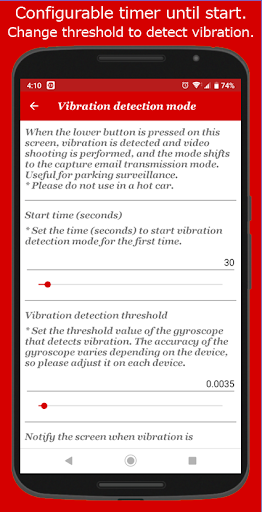 In vibration detection mode, if a gyroscope sensor detects a vibration exceeding an arbitrary threshold, it will notify you by email. A snapshot of the previous and next videos will be attached to the email. The location information notification function sends location information by e-mail when a distance exceeding an arbitrary threshold is moved at regular time intervals. It is a powerful tool for parking monitoring of your car.