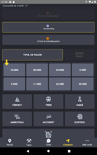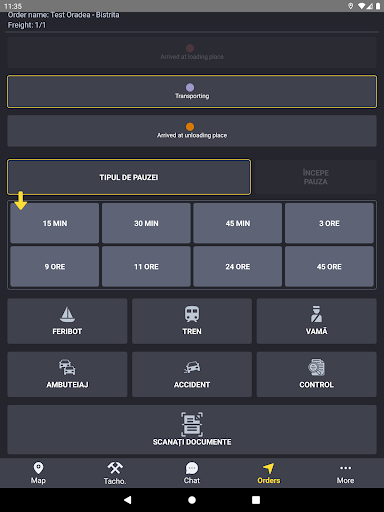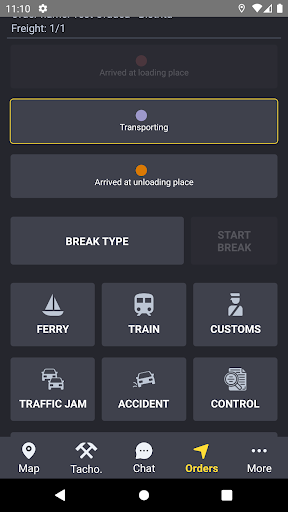 Drivers can mark the current status of the freight orders, thus streamlining order monitoring by fleet operators; as well as quickly signaling any scheduled or unforeseen events, such as daily breaks, traffic jams, border crossings or accidents.