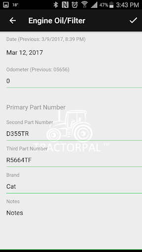 TractorPal simplifies your record-keeping process. TractorPal records each item’s maintenance (e.g., changing oil, filters, tires, and irregular repairs, or add your own) This app will even record the part numbers you used!
