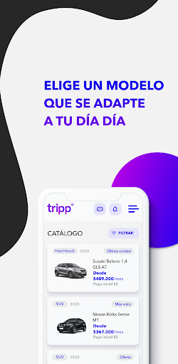 ¿Cómo es eso? Con tripp te suscribes a un auto (así como Netflix, Spotify y otros), y la cuota incluye Seguro, impuestos, Auto de Reemplazo y Mantenciones. Accede y escoge tu tripp del amplio catálogo que tenemos para ti. Tu suscripción es totalmente personalizable; escoges tu auto, periodo y kilometraje anual.