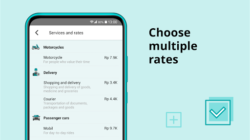 The Motorcycle rate is for people who value their time. The Auto rate is for daily rides. Use our Courier rate if you need to send documents or parcels to somebody. Choose Shopping and Delivery rate if you want your driver to buy groceries, food, or other goods for you and deliver them to you.