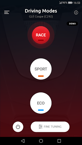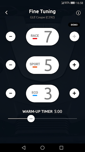 Experience the tuning effect in its most innovative form yet – more power for your car with the tuning module. Fine tune the respective settings to perfectly match your car’s specifics and your personal driving style. Map these settings to three easy to the access driving modes Eco, Sport and Race.