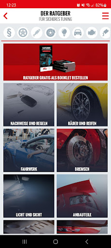 Mit dem Ratgeber für sicheres Tuning bietet die App ein großes Tuning-Lexikon zu allen relevanten Veränderungsmaßnahmen am Fahrzeug. Ob Räder und Reifen, Fahrwerke, Bremsen, Licht und Sicht, Anbauteile, Motor, Abgasanlage oder Interieur – der Tuning-Ratgeber geht auch alle Themen und Maßnahmen ein. Dazu gibt es einen Einblick in Nachweise und Regeln, Polizei-Tipps und es wird auf die gegenseitige Beeinflussung eingegangen.