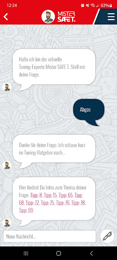 Über die Ratgeber-App könnt Ihr auch direkt mit dem virtuellen Tuning-Experten MR. SAFE T. chatten. Stellt Eure individuelle Frage zu Eurem Tuning-Projekt und MR. SAFE T. sucht eine entsprechende Antwort für Euch heraus. Sollte die passende Antwort noch nicht dabei sein, könnt Ihr direkt eine E-Mail an den virtuellen Tuning-Experten senden und erhaltet eine konkrete Antwort auf Eure Frage