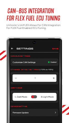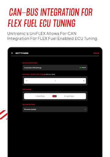NOTE: This app requires a custom Bluetooth module (Unitronic UniFLEX) to allow for wireless ethanol content viewing. This app requires customized ECU Performance Software calibrated to add Flex Fuel functionality over your vehicle’s CAN-BUS.