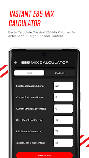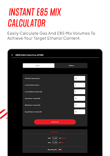 The included E85 Mix Calculator allows you to calculate current and future gas/ethanol content blends to ensure you can achieve your target ethanol content using your fuel tank size, current fuel level, current ethanol content, target ethanol content, and more!