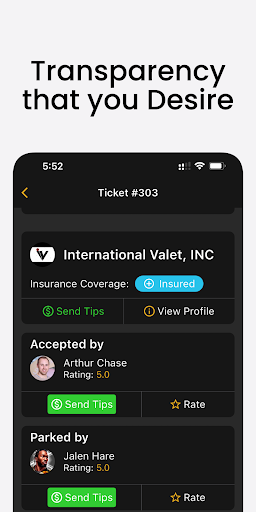 • Valet Identifier: Know who has driven your car. All virtual valet tickets in the app will show your ticket writer, arrival, and departure drivers.