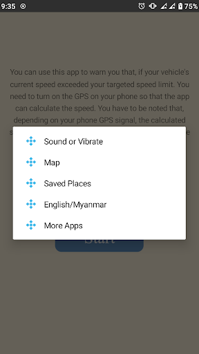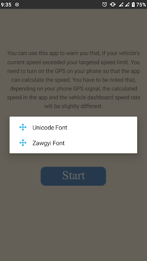 This app can calculate your vehicle speed by using your phone GPS. You can choose your safety speed and when your vehicle run more than that, App will notify you with the beep sound, Myanmar sound, English sound or sound together with vibration.