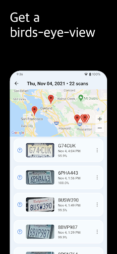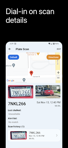 All scans include the original full frame of capture as well as the license plate cropped image. A geolocation tag is also included and displayed on a map. Full and partial plate searches are supported.
